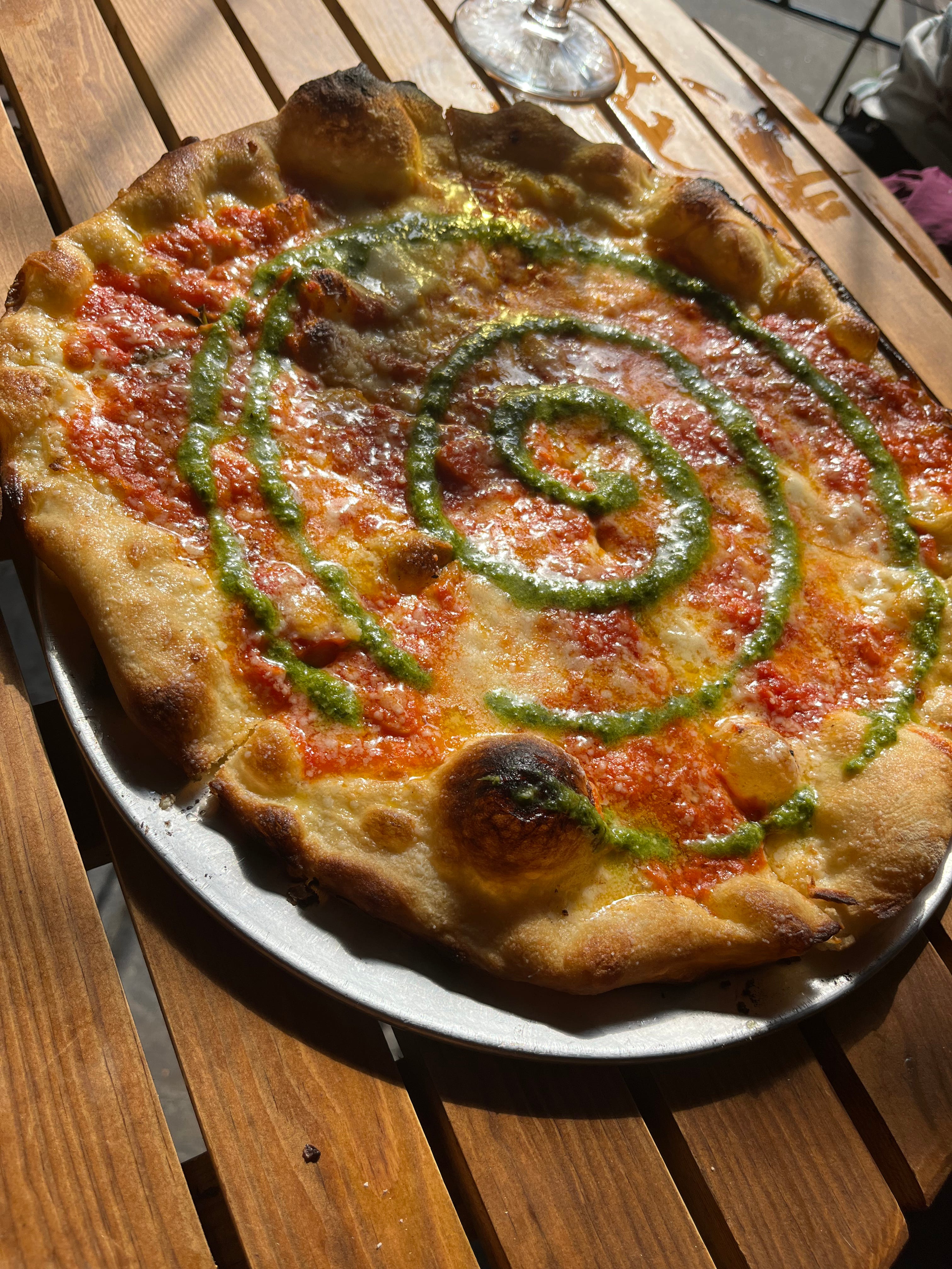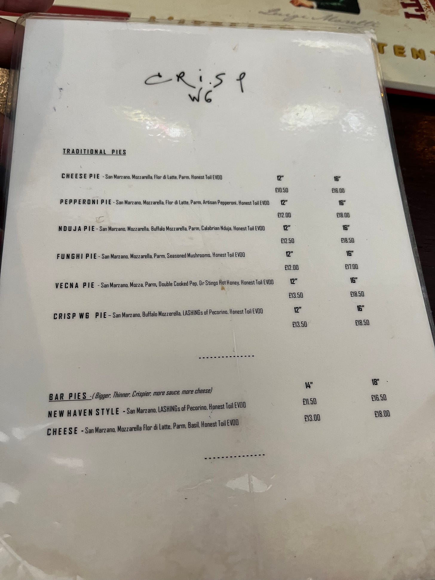 The menu is nice and simple, not 100 different combinations or really insane toppings etc.5 Catering for a majority of people with classics and a few modern twists . The 12inchers are probably the perfect size for 2/3 people, any more and I’d recommend the 16inch. They’re currently doing a special called the picante which is the regular Crisp pie with a pesto swirl.
