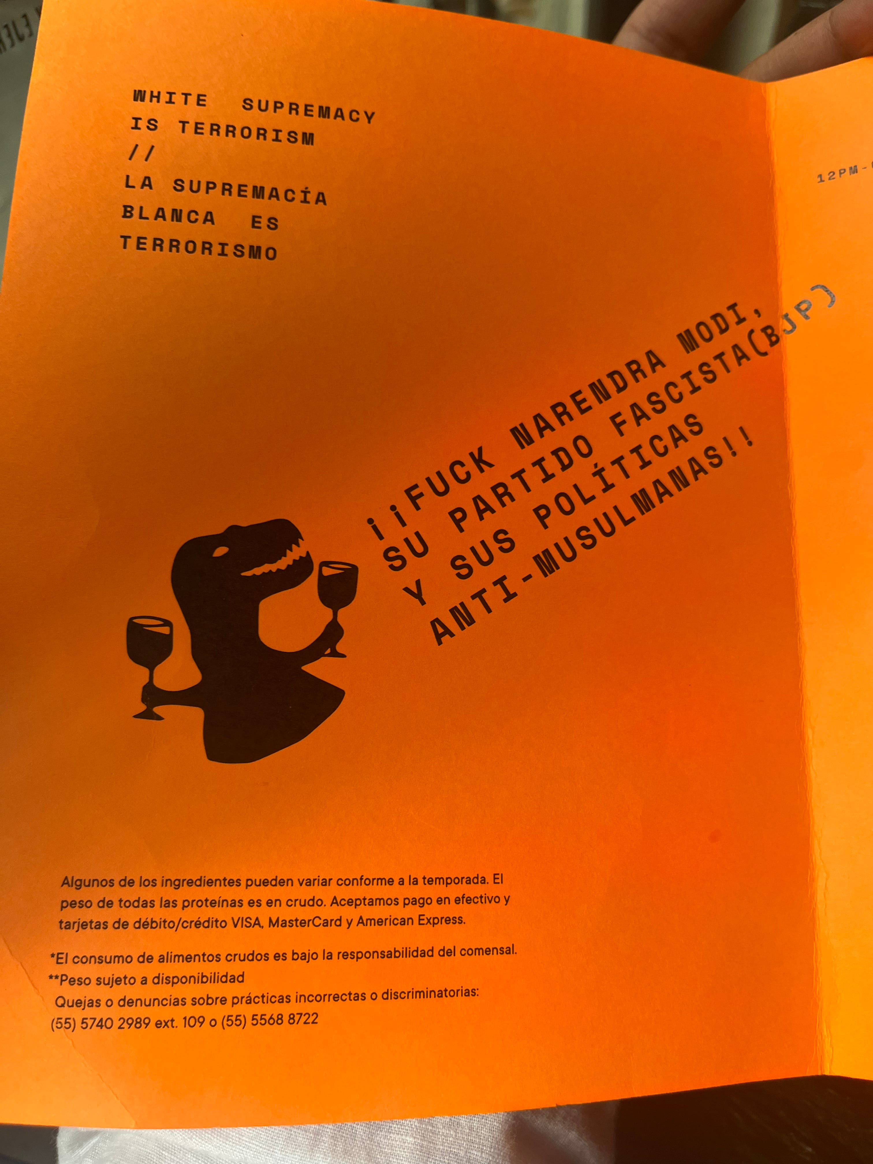 After the waiter sat us down, a man walked over. He was a blend of so many styles; a loud and bold shirt, denim apron, Birkenstock mules and to top it off a giant beaded necklace. The man turned out to be one of the founders and chefs, Chef Saqib. He was super personable and friendly, and willing to engage with customers. His style didn’t end with fashion either as he’s possibly owner/curator of the greatest playlist I’ve ever heard. Honestly I’ve never been anywhere; restaurant, friends house, and concerts where I’ve Shazammed as many songs and thought OMG I need to have this song on my phone. Right kind of politics, as you’ll see on the menu. So yeah I thought he was kinda cool…I promise in person, we were much calmer and collected…I hope.