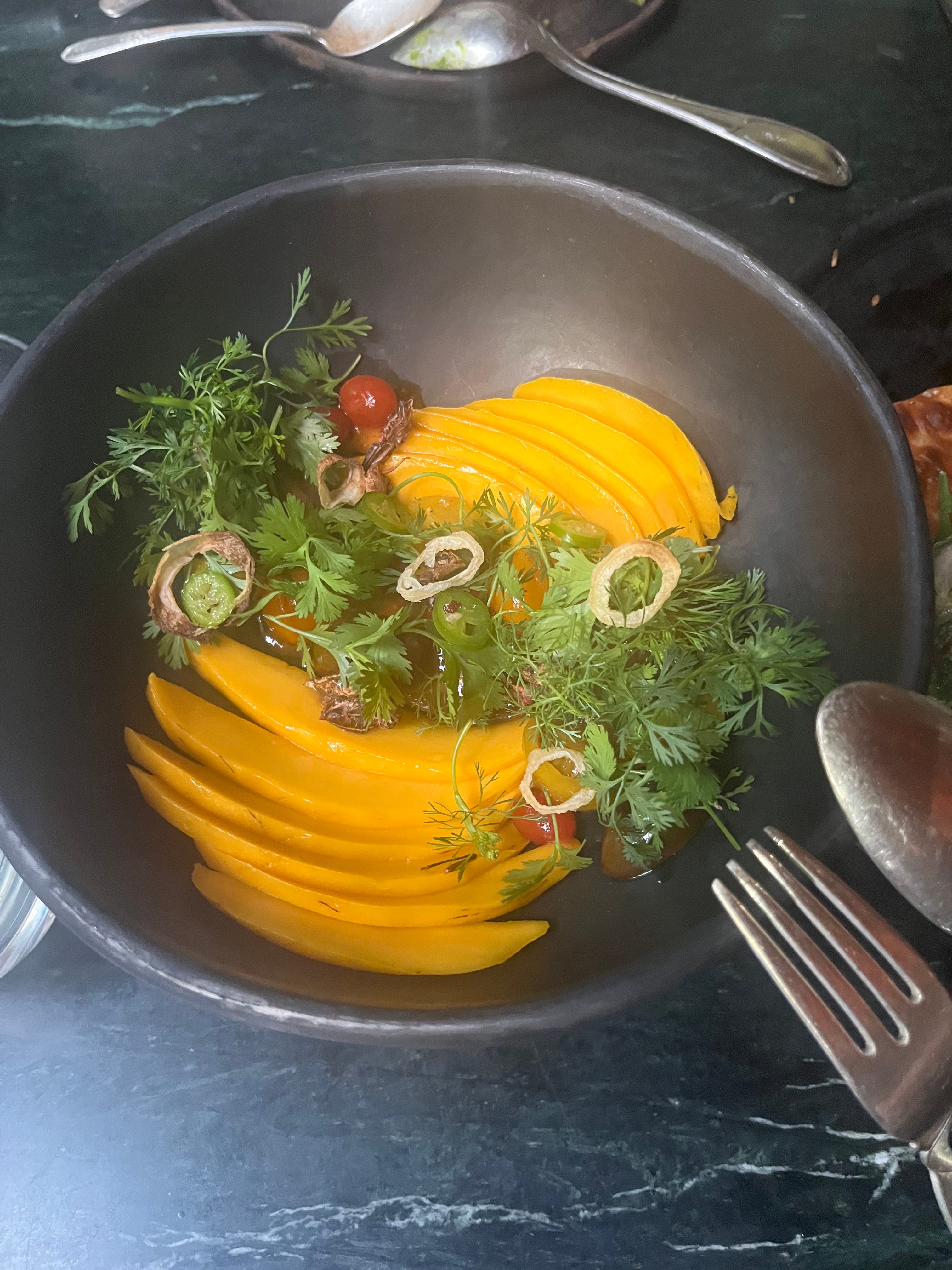 Ensalada de mango y chapulines, aderezo de tamarindo, semilla de mostaza, jitomate cherry, cebolla cambray y chile verde ………………………….. $195