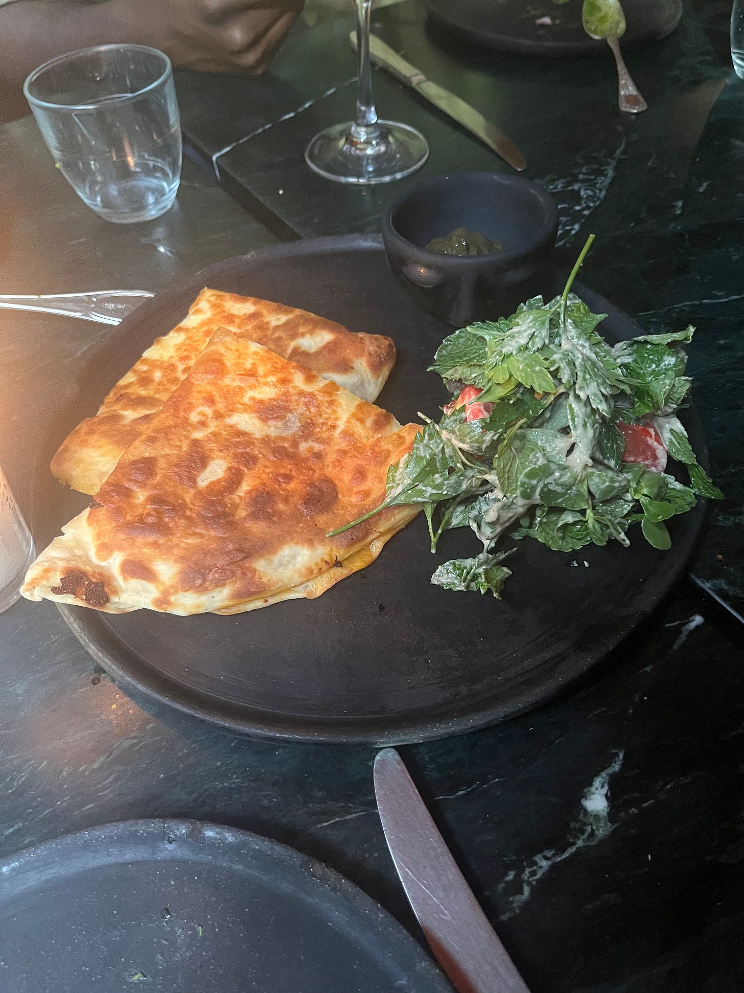 Paratha quesadilla with mountain cheese, spicy salsa, herb salad and heirloom tomatoes