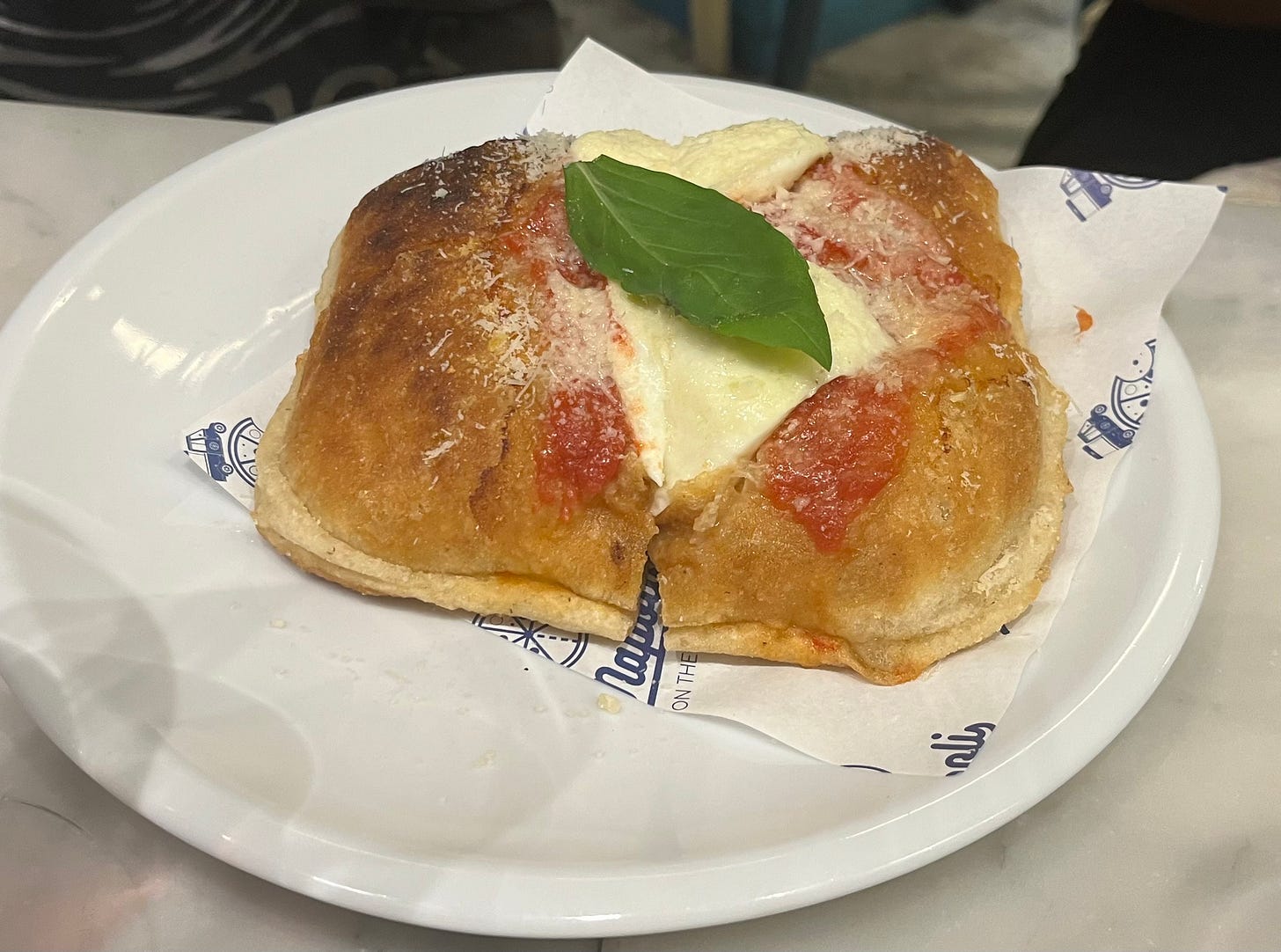 A double cooked pizza dough, first fried and then finished in the oven with ragu of tomato sauce, buffalo mozzarella, basil leaf