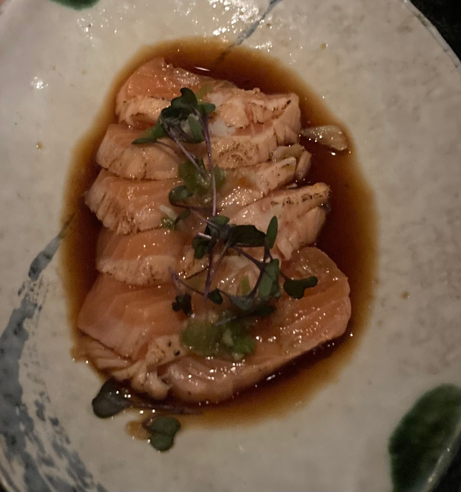 I saw on the menu, pork meatballs, and thought “well that’s a safe dish for me”. I was hopeful the Yuzu and Miso would elevate the dish to a higher culinary plane. Sadly, it stayed on a very basic plain level. The Miso and Yuzu were sparingly used because it didn’t make much of an impression. My partner was out on these simply from the smell, so yeah more miss than hit .Shake Teriyaki (Salmon)