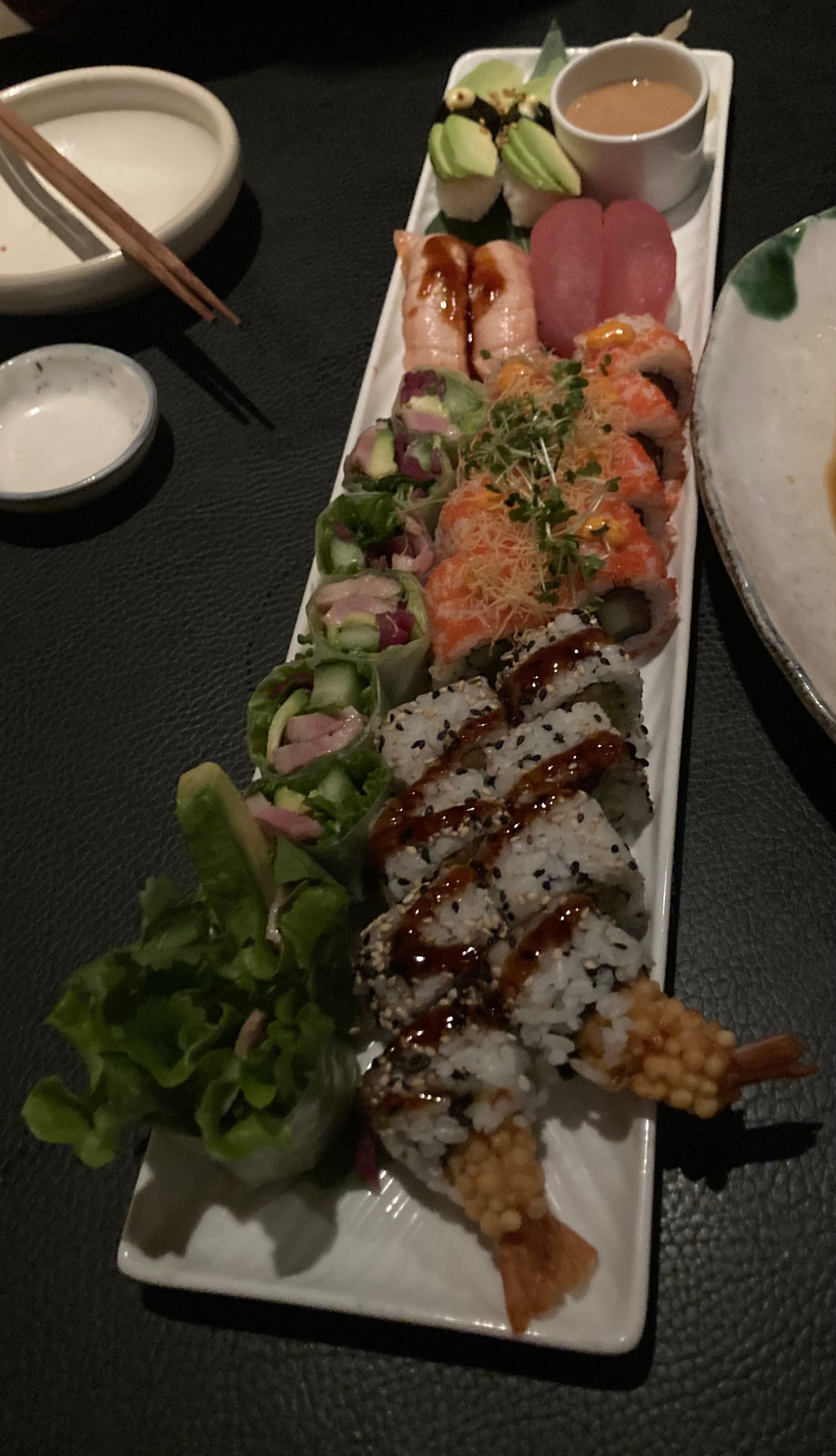 Tempura Shrimp, avocado, spicy sauce & tsume soyaMy favourite thing I had on this platter. I could have had about 20 of these. I’m not even a shrimp fan, or so I thought! Turns out I was just having overcooked, trash shrimp. The lightly fried tempura was excellent and provided the perfect textural counter balance to the creamy avocado. The spicy sauce left your mouth watering and wanting MORE. Pitched at the exact right level of spicy to make you notice but not overpower the rest of the piece. Cannot emphasize how life changing this sushi was.