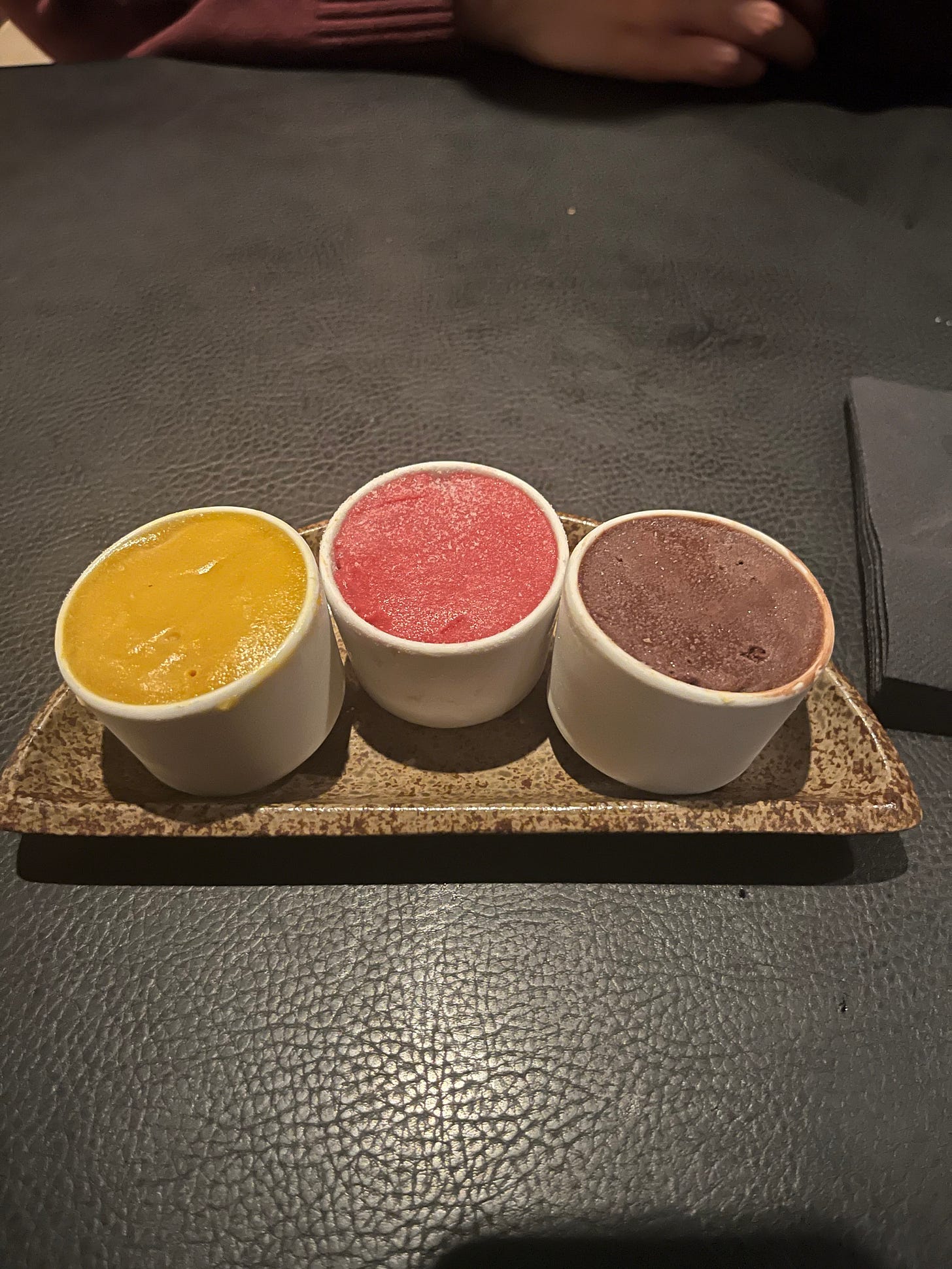 A sorbet trio, Sun riped Alphonso Mango, Chocolate & Avola Almonds, Blackcurrants picked from Thy in Denmark£6 Rating : 7.3/10